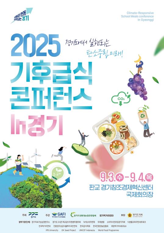 도는 오는 9월 3일과 4일 이틀간, 성남 판교 경기창조경제혁신센터 국제회의장에서 ‘2025 기후급식 콘퍼런스 in 경기’를 개최한다고 26일 밝혔다. 이번 행사는 ‘기후위기 시대, 공공급식의 새로운 길을 묻다’를 주제로, 국내외 전문가와 정책 관계자, 시민사회 등이 참여해 기후급식 정책의 성과와 미래 방향을 논의한다.