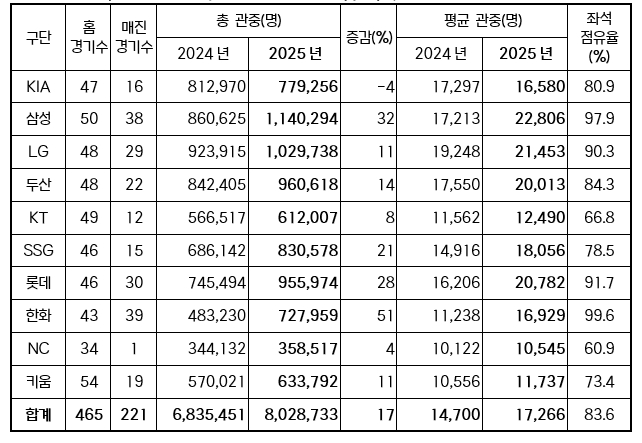 ▲ 2025년 구단별 관중 현황(2024-2025 홈 경기수 비교) |