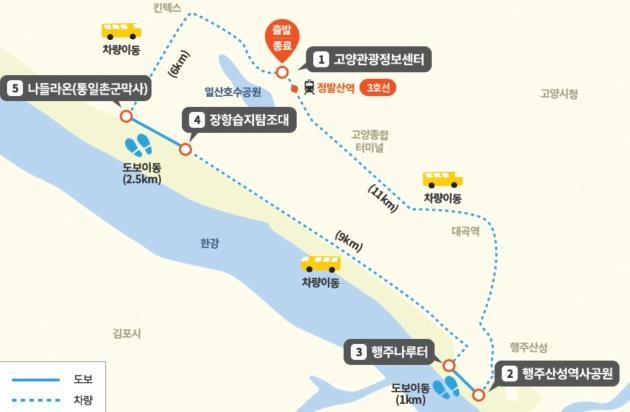 ‘고양 장항습지생태 코스’는 행주산성 역사공원, 장항습지생태관 관람과 행주산성 역사공원과 나들라온(통일촌 군막사)을 도보로 걸으며 체험한다. ‘김포 한강하구~애기봉 코스’는 임진강·예성강·한강이 합류하는 조강(祖江)과 북한의 선전마을을 볼 수 있다. ‘파주 임진각~도라산 코스’는 임진강변 생태탐방로와 북한 개성 시내가 보이는 도라전망대와 평화염원의 상징 도라산평화공원 등 평화안보관광지를 포함하고 있다. ‘연천 1.21침투로 탐방 코스’는 1.21(김신조) 무장공비 침투사건의 주요 지점으로 삼국시대 군사 요충지였던 호로고루를 포함하고 있다.