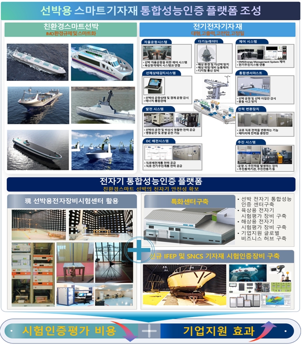 '선박용 스마트기자재 통합성능인증 플랫폼 조성사업'은 환경규제로 인한 '친환경스마트 선박의 전기전자화'라는 선박 패러다임 변화에 선제적으로 대응하고자, 부산을 중심으로 선박기자재 전자기의 통합성능 인증 플랫폼을 구축해 중견·중소 기업의 기술개발, 부품 국산화, 시험인증 등을 지원하는 사업이다.