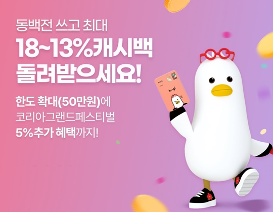 11~12월의 캐시백 요율은 9~10월과 같이 최대 13퍼센트(%)를 유지하되, ‘코리아 그랜드 페스티벌’ 기간(10.29.~11.9.)에만 한시적으로 ▲최대 18퍼센트(%) 캐시백 요율을 적용하고 ▲50만 원의 별도 한도를 추가 적용하는 것이다.