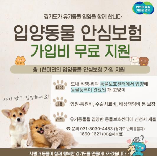 경기도 입양동물 안심보험 무한돌봄 지원사업은 DB손해보험과 함께 진행하며, 마리당 약 20만원 상당의 안심보험 가입을 무료로 지원한다. 올해는 총 1천여 마리의 입양 유기동물에 대해 지원할 예정이다.