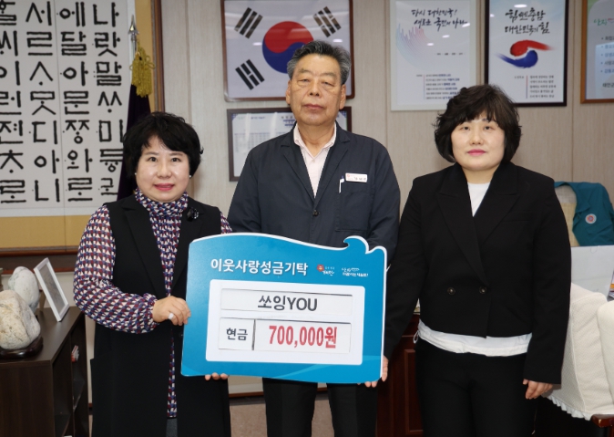 군에 따르면, 쏘잉YOU 장길순 회장과 고경원 총무는 지난 23일 군청 군수실에서 가세로 군수 등이 참석한 가운데 기탁식을 갖고 70만 원의 성금을 군에 기탁했다.