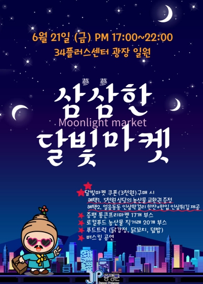 [뉴스서울] 충북 증평군이 34플러스센터(구 증평인삼관광휴게소, 증평읍 중부로 2451) 광장에서 오는 21일 ‘삼삼(蔘蔘)한 달빛마켓’ 야(夜)시장 행사를 연다.