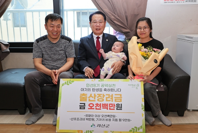 송인헌 군수는 “지역사회의 따뜻한 관심 속에서 아이들이 건강하고 씩씩하게 자라 행복한 가정을 꾸려가길 바란다”라며 “군에서는 출산가정의 경제적 부담을 경감시키고 아이 키우기 좋은 환경을 조성하기 위해 최선을 다하겠다”고 말했다.