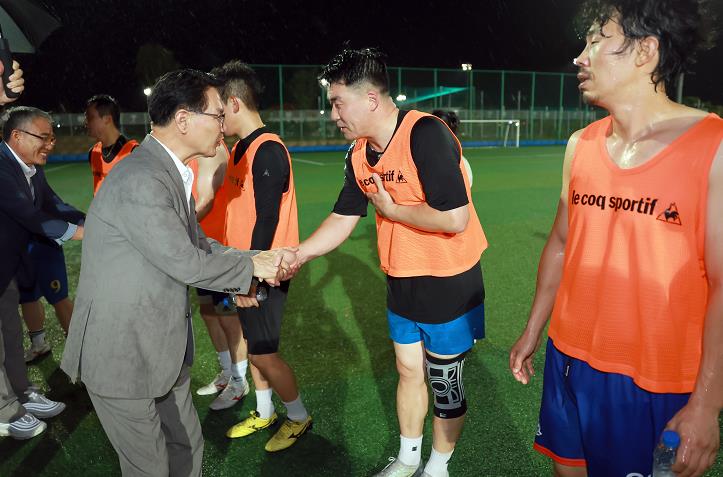 이날 심덕섭 군수는 족구 출전을 위해 연습하고 있는 스포츠타운 족구장을 시작으로 탁구, 야구, 축구 전용구장, 풋살 연습장인 나들목 공원 등을 차례로 방문해 격려했다.