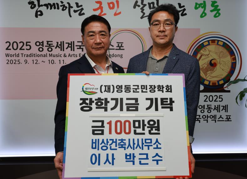 [뉴스서울] 비상건축사사무소 박근수 이사가 지난 26일 영동군을 찾아 (재)영동군민장학회에 100만원의 장학금을 맡겼다.