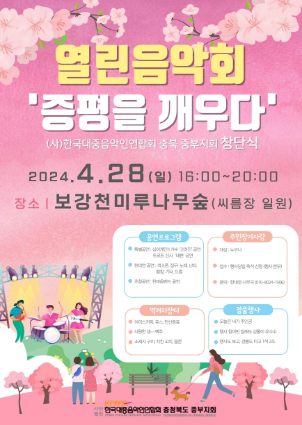 [뉴스서울] 충북의 문화 발전과 문화 봉사활동 사업을 펼치는 문화인의 모임인 (사)한국대중음악인연합회 중부지회가 지난 28일 오후 4시 증평군 보강천 미루나무숲 야외 특설무대에서 창단식 및 열린음악회를 개최했다.
