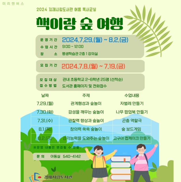 [뉴스서울] 김제시립도서관은 오는 29일부터 8월 2일까지 5일간 지역 초등학생 2 부터 6학년 25명을 대상으로 여름 독서교실 프로그램인 '책이랑 숲 여행’을 운영한다고 밝혔다.