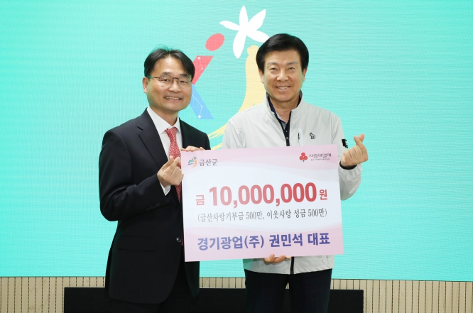 [뉴스서울] 금산군 진산면 소재 경기광업주식회사 권민석 대표는 지난 24일 금산군 발전 및 이웃사랑을 위해 고향사랑기부금 최고한도액 500만 원 및 이웃사랑 성금 500만 원 총 1000만 원을 전달했다.