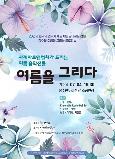 ‘2024년 무대공연작품 제작지원사업’을 통해 군이 주최하고, 사계아크앤컬처 주관으로 마련된 ‘여름을 그리다’는 클래식 음악 공연에 장수군의 여름을 주제로 그리는 드로잉쇼를 곁들인 순수예술 간의 합작 공연이다.