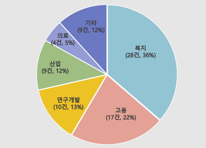 그리고 보상금 지급액이 가장 큰 분야는 ▴연구개발(3억8천여만 원, 37%)▴고용(2억4천여만 원, 23%) ▴의료(1억5천5백여만 원, 15%) ▴복지(1억3천여만 원, 13%) 순이었다.