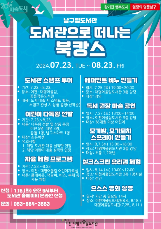 '도서관으로 떠나는 북캉스' 행사와 관련된 사항은 남구립도서관 누리집 또는 SNS를 확인하거나 전화(☎664-3553)로 문의하면 된다.