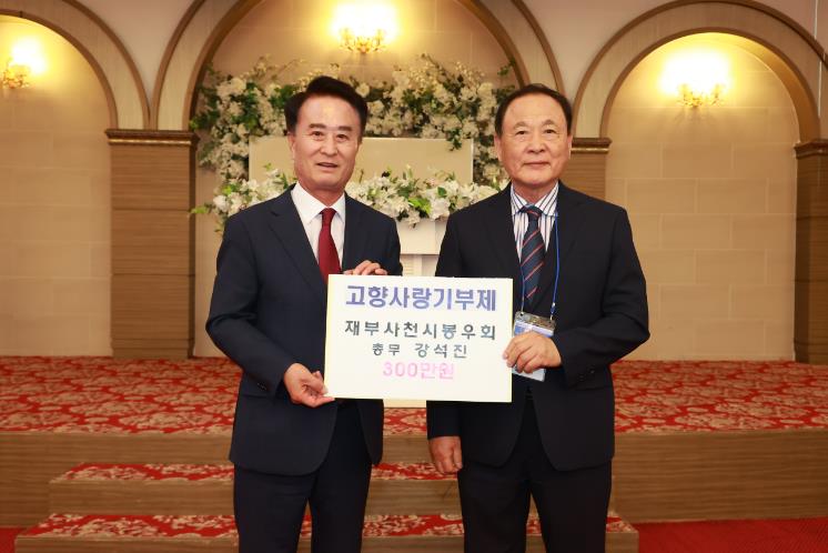 이덕길 재부사천시봉우회장과 강석진 전 재부삼천포향우회장이 지난 28일 우주항공청 개청 기념으로 열린 사천시 고향방문의 날 행사에서 고향사랑기부금 100만 원과 300만 원을 각각 기탁했다.