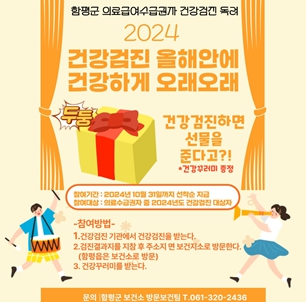 [뉴스서울] 전남 함평군 보건소가 2024년 의료급여수급권자 건강검진 독려를 위해 올해 10월 31일까지 5개월간 건강검진 수검 인증 행사를 진행한다.