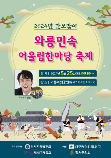 [뉴스서울] 대구 달서구는 오는 5월 25일 오전 10시부터 와룡아랫공원(이곡동 소재)에서 단오를 맞아 민속씨름, 전통놀이 등 우리고유의 다양한 민속 문화를 체험해 볼수 있는'2024 와룡민속어울림한마당'행사를 개최한다.