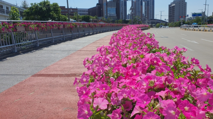 이에, 구는 올해 조성 사업에 ▲제2치수교 ▲제1치수교 ▲대신교 ▲새들뫼교 ▲삼가교 등 5개의 교량을 추가했으며, 웨이브 페튜니아 4만여 본을 식재해 총 10개 교량에 걸쳐 분홍빛 꽃물결을 이루는 장관을 연출하게 됐다.