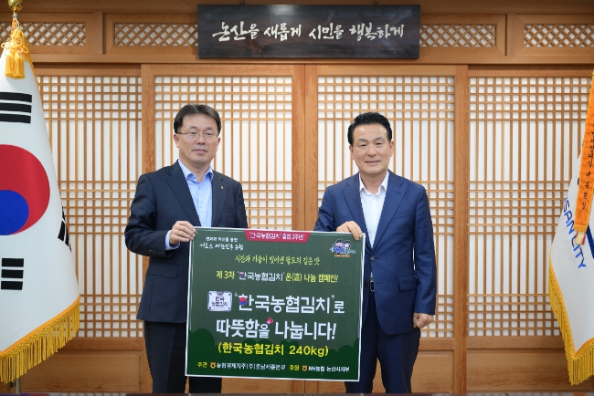 [뉴스서울] NH농협 논산시지부(지부장 김동진)과 (사)우리농업지키기운동본부 충남세종본부는 지난 23일 저소득층을 위한 선풍기 100대(700만 원 상당)와 김치 100박스(300만 원 상당) 등 총 1천만 원 상당의 물품을 논산시에 기탁했다.
