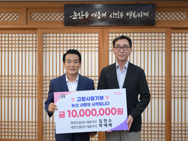 [뉴스서울] 명헌건설(주) 김정수 대표이사와 세헌건설(주) 박애래 대표이사가‘고향사랑기부금’개인 최대금액인 500만원씩, 총 1천만원을 논산시에 기부하며 남다른 고향 사랑을 보였다.