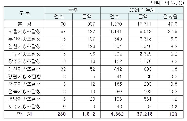 지역별 발주량을 보면 대전광역시 소재 본청 907억 원, 서울지방청 197억 원 등 2개청(1,104억 원)이 전체 금액(1,612억 원)의 68.5%를 차지하고 있으며, 인천 등 나머지 10개 지방청 508억 원이 각각 집행될 예정이다.
