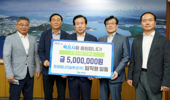 박홍률 목포시장은 “지역 사랑을 몸소 실천해주신 환경에너지솔루션 임직원 여러분께 진심으로 감사드린다, 소중한 기부금은 지역을 위해 뜻깊게 사용하겠다“라고 말했다.