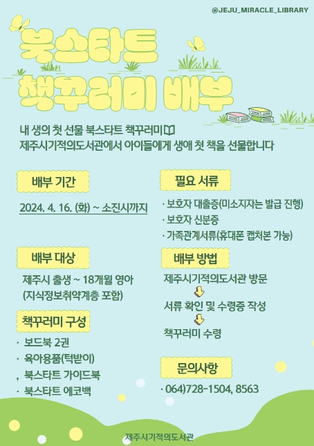 [뉴스서울] 제주시기적의도서관은 생후 18개월 이하 영아에게 책을 선물하는 2024년 북스타트 책꾸러미를 4월 16일부터 50명에게 배부한다.