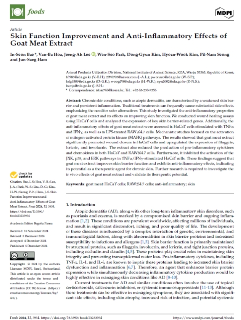 연구진은 이번 연구가 염소 고기가 피부 질환 개선에 활용할 수 있는 과학적 기초자료를 확보했다는 데 의의를 두고 있다. 연구 결과는 국제학술지 Foods에 게재됐다.