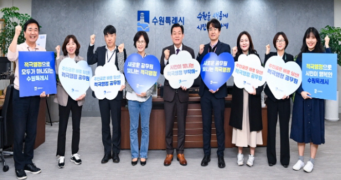 ▲ 이재준 수원시장(가운데)과 공직자들이 적극행정 실천을 다짐하는 내용이 담긴 손팻말을 들고 있다. |