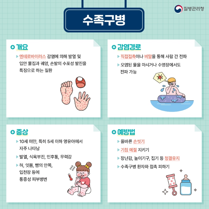 수족구병은 특히 개인위생이 취약하고 집단생활을 많이 하는 영유아(0~6세)를 중심으로 많이 발생하며 발열, 식욕부진, 인후통, 피로감을 시작으로 손, 발, 입안의 물집과 궤양 등을 동반하는 질환으로 매년 야외 활동이 늘어나는 6월부터 증가하여 8월에 가장 많이 발생하는 여름철 질환이다.