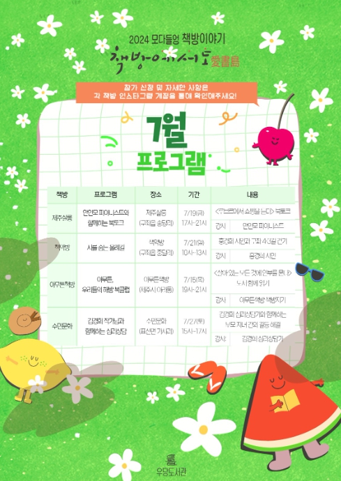 [뉴스서울] 제주시 우당도서관은 2024년'모다들엉 책방 이야기'‘책방에서도(愛書島)’ 7월 프로그램을 운영한다.