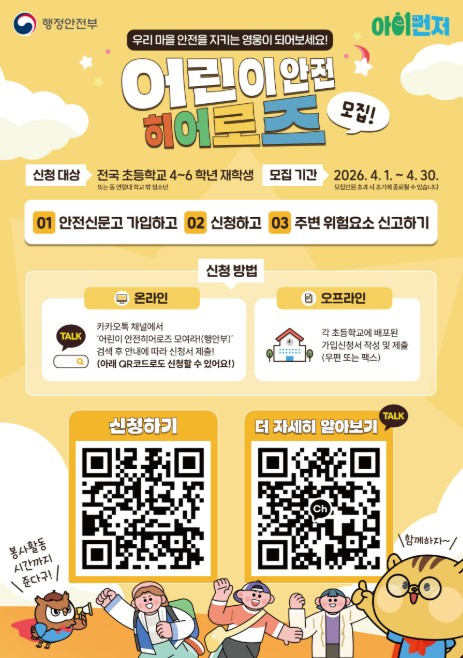 [뉴스서울] 행정안전부는 4월 1일부터 30일까지 ‘어린이 안전히어로즈’ 신규 대원을 모집한다.