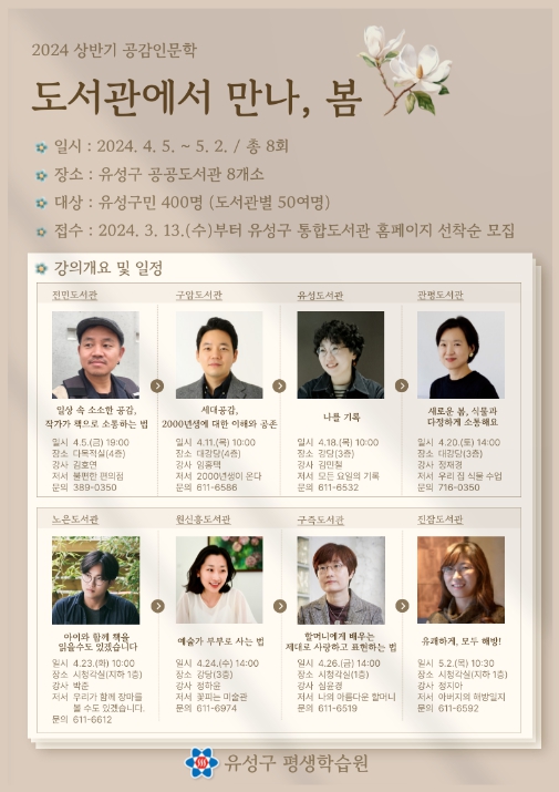 정용래 유성구청장은 “SNS 위주로 소통하는 디지털 사회 속에서 이번 공감인문학을 통해 책으로 소통하고 인문 소양도 키우는 기회가 되길 바란다”며 “앞으로도 주민이 가까운 도서관에서 휴식하며 지식을 쌓을 수 있는 프로그램을 지속적으로 추진하겠다”고 말했다.