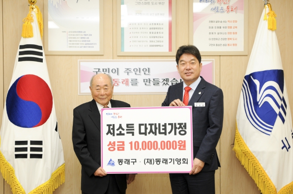 [뉴스서울] 부산 동래구는 지난 27일 (재)동래기영회으로부터 저소득 다자녀가정을 위한 성금 1,000만 원을 기탁받았다고 밝혔다.