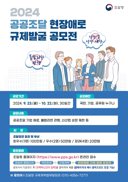 [뉴스서울] 조달청은 국민과 기업의 눈높이에서 규제개선 과제를 발굴하고 해소하기 위하여 공공조달 현장규제 공모전을 개최한다고 밝혔다.