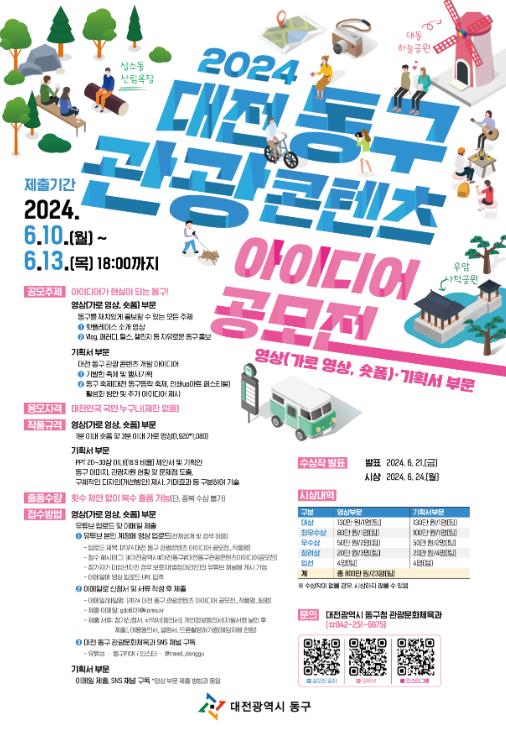 [뉴스서울] 대전 동구는 동구의 아름다운 자연과 관광자원을 담은 영상 및 축제 · 여행코스 기획 등 전 국민을 대상으로 톡톡 튀는 아이디어를 뽑는 ‘2024 대전 동구 관광콘텐츠 아이디어 공모전’을 개최한다고 24일 밝혔다.