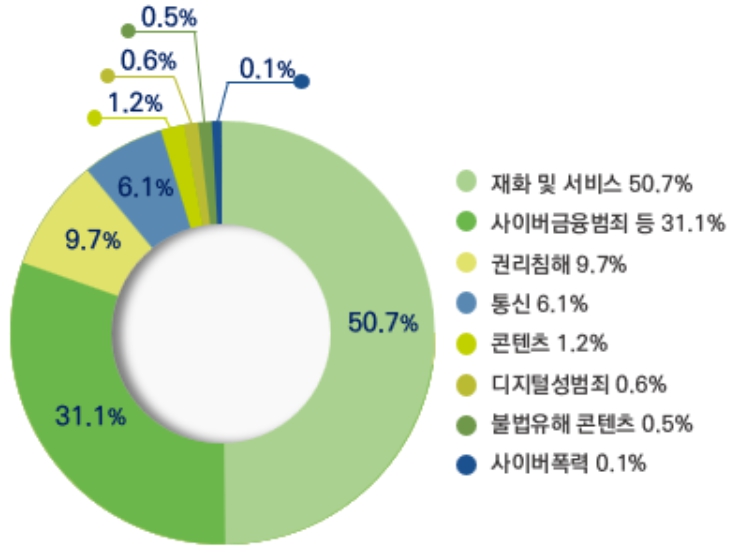 2024년 피해유형별 상담 건수는 ‘재화 및 서비스’ 관련 상담이 1,955건(50.7%)으로 가장 많았고, 뒤이어 ‘사이버 금융범죄 등’ 1,199건(31.1%), ‘권리침해(개인정보 침해 등)’ 374건(9.7%), ‘통신’ 236건(6.1%), ‘콘텐츠’ 45건(1.2%), ‘디지털 성범죄’ 25건(0.6%), ‘불법유해 콘텐츠’ 20건(0.5%) 등의 순이었다.