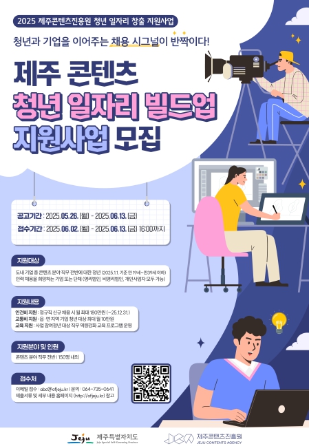 [뉴스서울] 제주콘텐츠진흥원은 제주특별자치도와 함께 청년 일자리 창출과 도내 콘텐츠 산업 활성화를 위한 신규 일자리 지원사업인 「2025 제주 콘텐츠 청년 일자리 빌드업 지원사업」의 참여기업을 모집한다.