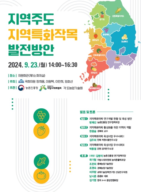 [뉴스서울] 농촌진흥청은 9월 23일 국회 의원회관에서 지역특화작목의 발전 방안을 논의하기 위한 국회 토론회를 개최했다. 정희용, 이원택, 이만희, 임호선 국회의원이 공동 주최하고, 농촌진흥청, 지방시대위원회 및 9개 도 농업기술원이 주관한 이번 토론회는 지역 주도의 균형발전과 자립적 성장을 지속해서 지원하기 위해 산・학・관・연의 협력 방안을 모색하는 자리였다.