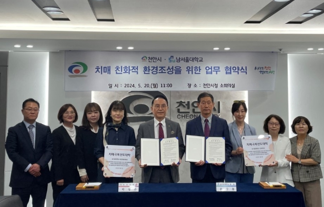 [뉴스서울] 천안시가 ‘치매극복선도대학’으로남서울대학교를 지정하고20일 ‘치매 친화적 환경조성을 위한 업무 협약’을 체결했다.