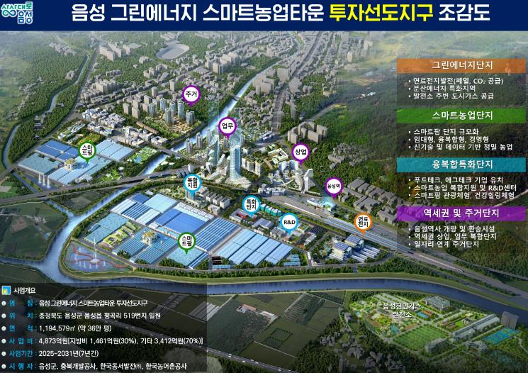 군은 2025년 실시계획 수립을 시작으로 음성읍 평곡리, 신천리, 읍내리 일원 119만㎡에 4873억원을 투자해 2025년 실시계획 수립을 시작으로 스마트팜 부지조성, 역세권 및 배후주거단지 조성 등 2031년까지 모든 사업을 마무리한다는 계획이다.