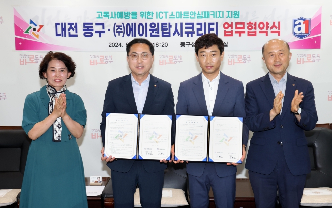[뉴스서울] 대전 동구는 지난 13일 구청장 접견실에서 ㈜에이원탑시큐리티와 고독사 예방을 위해 정보통신기술 활용 안심 지원(ICT스마트안심패키지) 관련 업무협약을 체결했다.