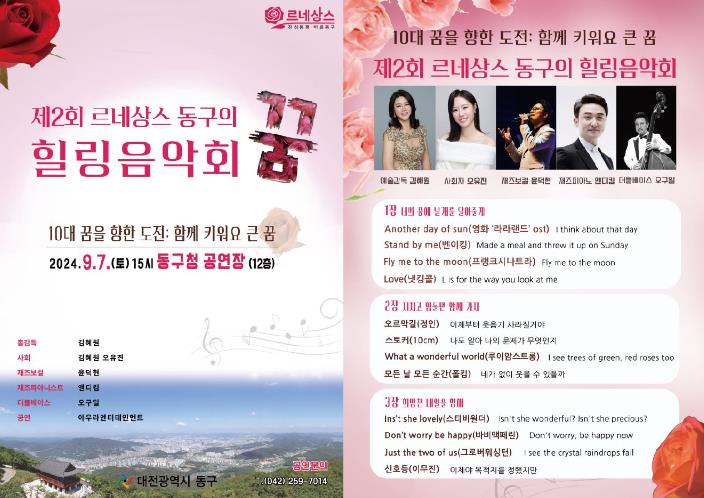 [뉴스서울] 대전 동구는 다음 달 7일 오후 3시 구청 12층 공연장에서 ‘10대 꿈을 향한 도전, 함께 키워요 큰 꿈’을 주제로, ‘제2회 르네상스 동구의 힐링음악회‘를 개최한다.