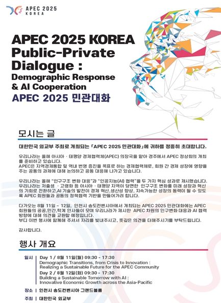 [뉴스서울] 인천광역시는 외교부 주관으로 오는 8월 11일부터 12일까지 송도 컨벤시아에서 “APEC 2025 민관대화(Public-Private Dialogue)”가 열린다고 밝혔다.