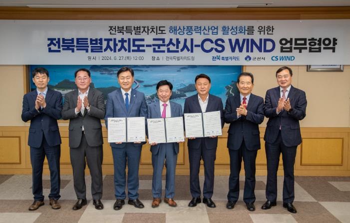 [뉴스서울] 군산시는 27일 전북도청에서 강임준 군산시장을 비롯 김관영 도지사, 김성권 씨에스윈드 회장, 정세균 前 총리 등 관계자가 참석한 가운데 해상풍력 및 신재생에너지 사업 협력을 위한 업무협약을 체결했다.