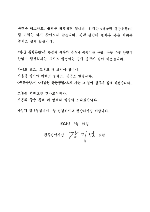 강기정 광주광역시장은 21일 “무안공항에 대해 드리고 싶은 말씀이 많아 펜을 들었다”며 무안군민에게 드리는 ‘약속의 편지1’를 띄웠다.