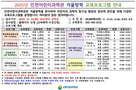 교육 신청은 2024. 12. 24.부터 선착순으로 이루어지며, 인천어린이과학관 홈페이지에서 할 수 있다. 자세한 교육과정은 인천어린이과학관 홈페이지 공지사항또는 전화로 문의하면 된다.