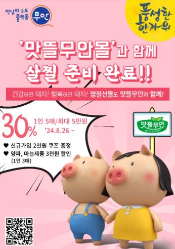 [뉴스서울] 전남 무안군은 다가오는 추석을 맞아 농특산물 온라인 판매처 ‘맛뜰무안몰’에서 30% 할인 기획전을 진행한다.