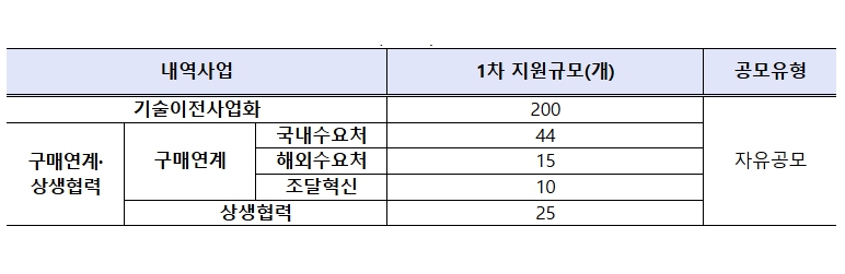 2026년 상반기 1차 지원 규모는 총 401억원 내외로, 294개 과제를 선정한다. 세부적으로는 기술이전사업화(1단계 PoC·PoM)에 200억원(200개), 구매연계·상생협력에 201억원(94개)이 투입된다. 이후 별도 공고를 통해 TRL점프업 및 구매연계 과제 지원을 추가적으로 추진할 예정이다.