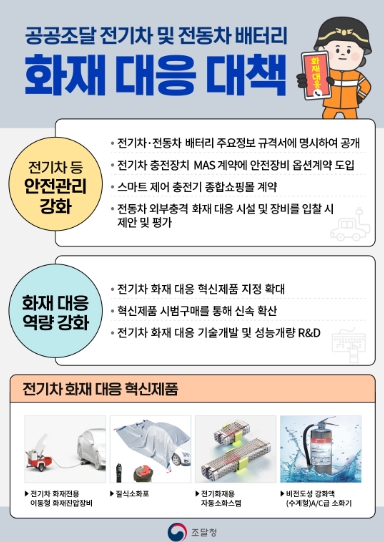 [뉴스서울] 조달청은 지난 6일 정부에서 발표한 '전기차 화재 안전관리 대책'에 맞춰 공공부문에서의 전기차·전동차 및 전기차 충전장치 안전관리 방안을 마련하여 속도감 있게 추진한다고 밝혔다.