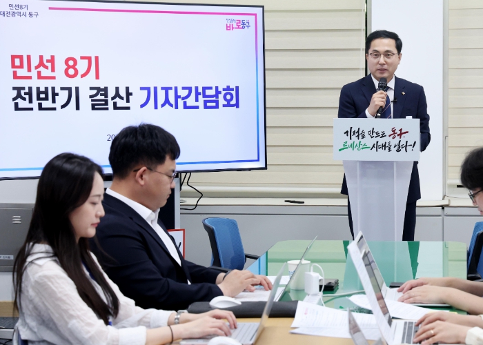 박희조 동구청장이 17일 대전시의회 기자실에서 민선 8기 전반기 결산 기자간담회를 열고 민선 8기 전반기 주요 성과와 함께 후반기 구정 비전 및 전략을 발표했다.